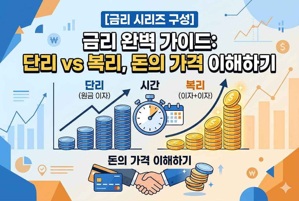 금리는 단순히 은행이 주는 보너스가 아니라 '돈의 시간 가치'이자 '사용료'입니다. 이자를 계산하는 두 가지 핵심 방식인 단리(Simple Interest)와 복리(Compound Interest)의 차이를 이해하는 것이 자산 형성의 첫걸음입니다. 원금에만 이자가 붙는 단리와 달리, 이자가 다시 이자를 낳는 복리는 시간이 지날수록 기하급수적인 자산 증식을 가능케 하며, 이를 '자본주의의 마법'이라 부릅니다.