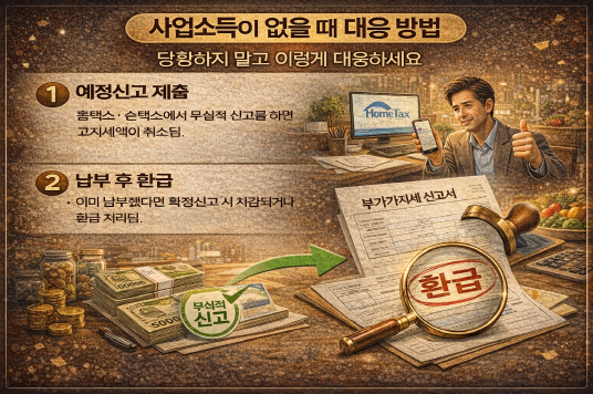 [핵심 요약] 사업소득이 없는데 부가가치세 예정고지를 받았다면 납부하지 말고 홈택스에서 무실적 예정신고를 제출하면 되며, 이미 납부했다면 확정신고 시 자동으로 차감·환급 처리됩니다.