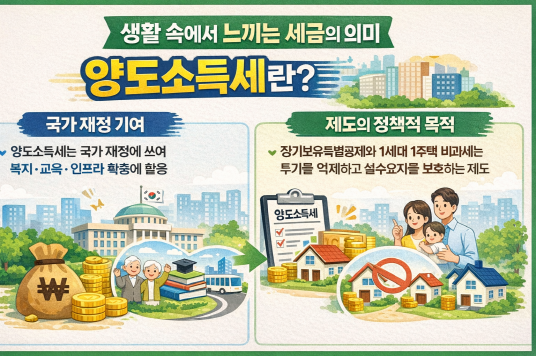 [핵심 요약] 집을 팔 때 내는 세금은 단순한 부담이 아니라 사회를 지탱하는 장치입니다. 양도소득세, 장기보유특별공제, 1세대 1주택 비과세 제도는 개인의 이익과 공동체적 가치가 연결되는 중요한 제도입니다.