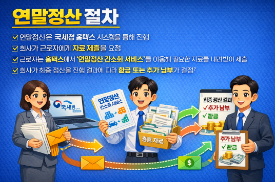 연말정산은 국세청 홈택스 시스템을 통해 진행됩니다. 회사가 근로자에게 자료 제출을 요청하면, 근로자는 홈택스에서 ‘연말정산 간소화 서비스’를 이용해 필요한 자료를 내려받아 제출합니다. 이후 회사가 최종 정산을 진행하고, 결과에 따라 환급 또는 추가 납부가 결정됩니다.