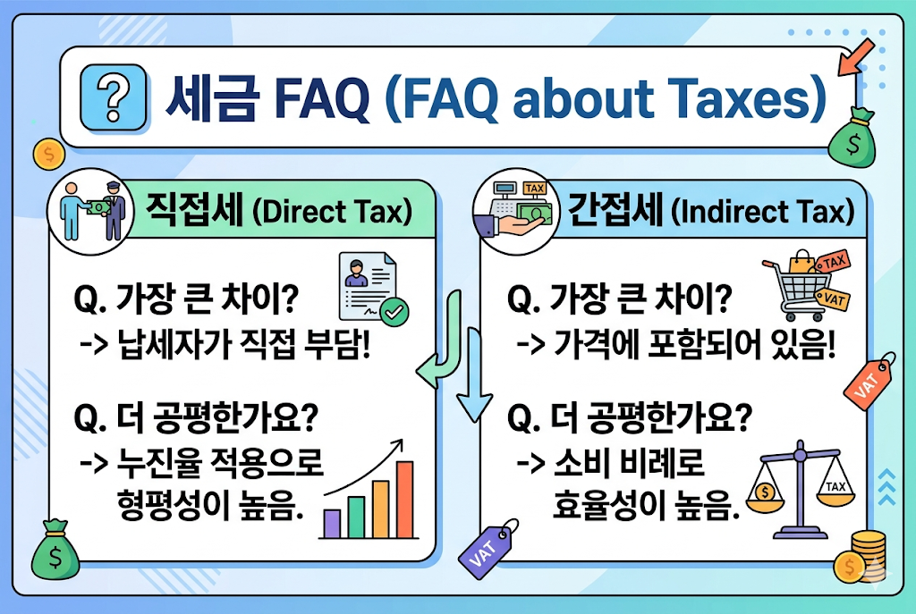 → 직접세는 누진율 적용으로 형평성이 높고, 간접세는 소비 비례로 효율성이 높습니다.