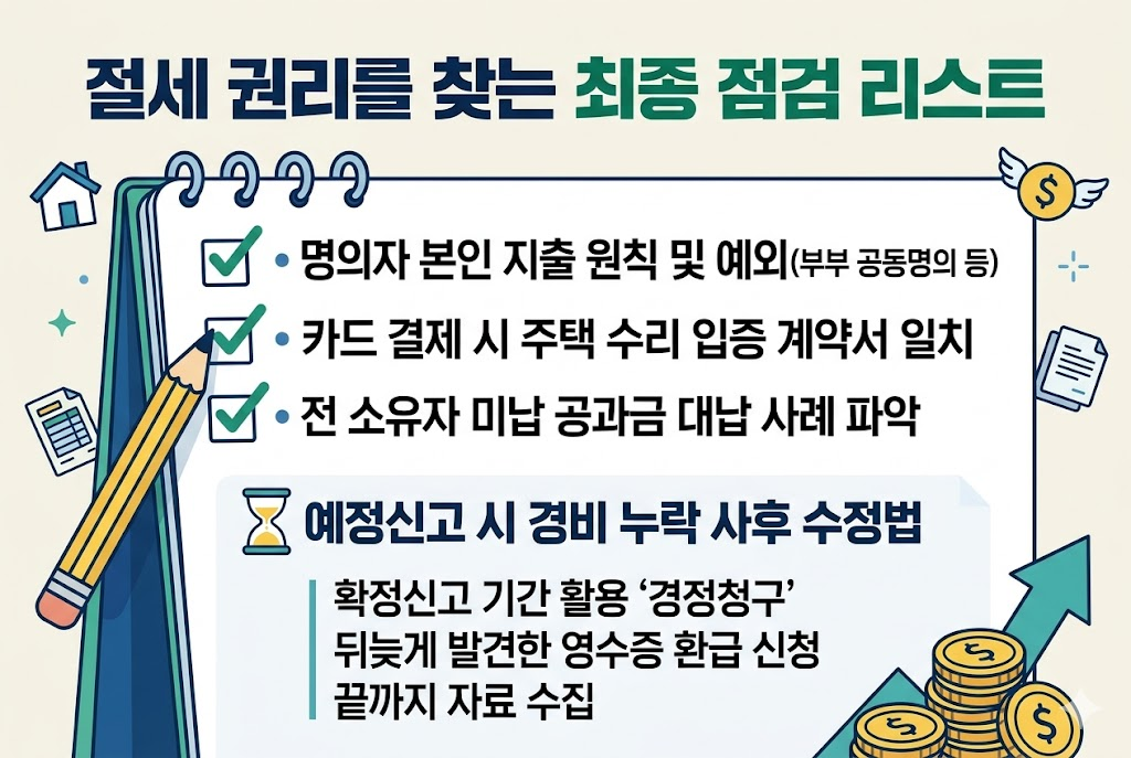 필요경비는 원칙적으로 해당 자산의 소유자가 지출해야 인정됩니다. 부부 공동명의라면 공동의 자금에서 지출된 내역을 증빙하는 것이 깔끔합니다. 만약 가족 중 한 명의 카드로 결제했다면, 해당 비용이 주택 수리를 위해 사용되었음을 입증할 수 있는 계약서와의 일치성이 중요합니다. 또한 전 소유자가 미납한 공과금을 대신 납부하고 매수한 경우 등 특수한 사례들도 미리 파악하여 신고 시 반영함으로써 단 한 푼의 세금도 더 내지 않도록 주의를 기울여야 합니다.⏳ 예정신고 시 경비 반영 누락의 사후 수정법