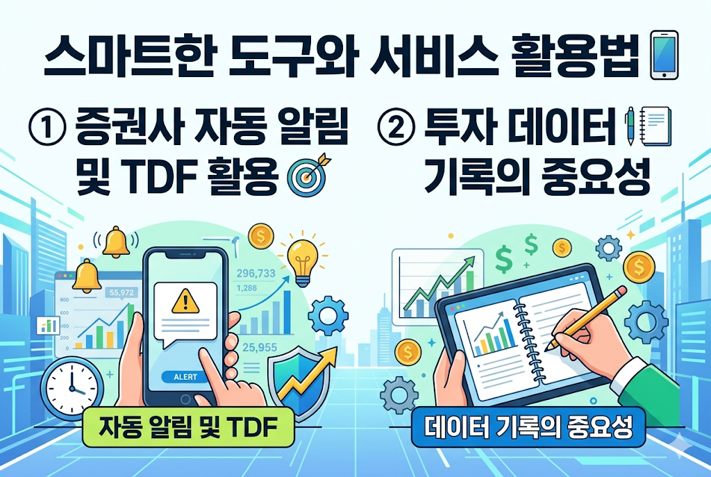증권사 앱의 목표 비중 알림 서비스를 활용하면 시장을 매일 감시하지 않아도 됩니다. 스스로 관리하기 어렵다면 은퇴 시점에 맞춰 자산 비중을 알아서 조절해 주는 TDF(Target Date Fund) 상품을 포트폴리오에 편입하여 자동화된 리밸런싱 효과를 누려보세요.