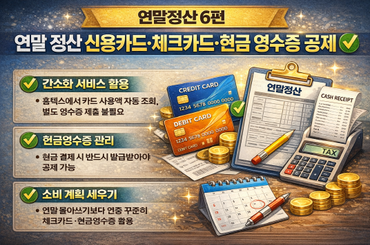 • 연말에 몰아서 소비하기보다는 연중 꾸준히 체크카드·현금영수증을 활용하는 것이 효과적입니다.