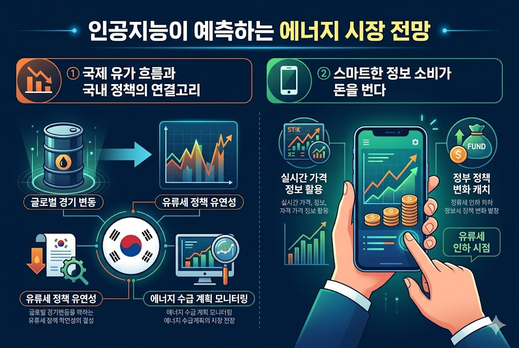 세금이 내려간다고 해서 낭비를 하기보다는, 효율적인 운전 습관을 유지하는 것이 진정한 절약의 완성입니다. 타이어 공기압 체크, 불필요한 짐 싣지 않기, 급출발·급제동 자제 등 기본적인 에코 드라이빙을 실천하면 유류세 인하 혜택에 더해 연비 개선 효과까지 누릴 수 있습니다. 또한 주유 시 아침이나 저녁 등 기온이 낮은 시간대를 이용하면 미세하게나마 더 많은 양의 기름을 채울 수 있다는 생활의 지혜도 잊지 마세요. 이번 정책 변화를 기점으로 본인의 유류비 지출 패턴을 다시 한번 점검해 보는 기회로 삼으시길 바랍니다.📢 5. 🤖 인공지능이 예측하는 에너지 시장 전망