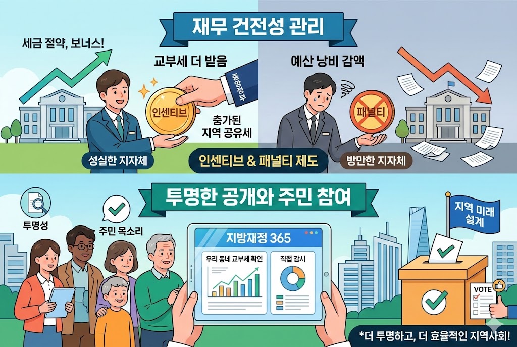 중앙정부는 지자체가 세금을 낭비하지 않고 효율적으로 운영하는지 꼼꼼히 살핍니다. 이를 '인센티브 및 패널티 제도'라고 합니다. 세금을 성실히 징수하고 예산을 절약한 지자체에는 교부세를 더 주고, 방만하게 운영한 곳은 감액합니다. 이러한 시스템은 지자체가 스스로 재정 건전성을 확보하도록 유도하며 소중한 혈세가 헛되이 쓰이지 않도록 감시합니다. 📉