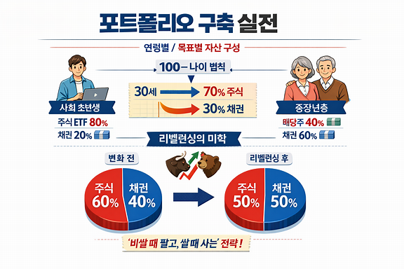 가장 클래식한 공식은 '100 - 나이' 법칙입니다. 100에서 자신의 나이를 뺀 수치만큼을 주식에, 나머지를 채권에 배분하는 방식입니다. 사회 초년생은 지수 추종 ETF를 중심으로 공격적인 성장을 꾀하고, 중장년층은 배당주나 채권 비중을 높여 현금 흐름을 만드는 전략이 유효합니다. 중요한 것은 정답이 아니라 본인이 시장의 하락을 견디면서도 목표 수익률을 낼 수 있는 비율을 찾는 것입니다.5-2. 🔄 리밸런싱의 미학