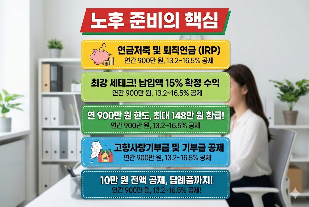 가장 강력한 세테크 수단입니다. 연간 900만 원 납입 시 소득에 따라 13.2%에서 최대 16.5%까지 공제받습니다. 900만 원을 꽉 채우면 연말에 약 148만 원을 돌려받는 셈입니다. 노후 자금을 저축하면서 연간 15% 수준의 확정 수익을 얻는 것과 다름없어, 전문가들이 입을 모아 추천하는 필수 가입 항목 중 하나입니다.