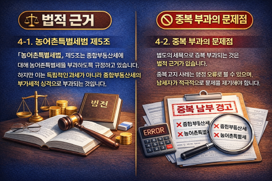 [핵심 요약] >종합부동산세는 고액 부동산 보유자에게 부과되는 국세이며, 농어촌특별세는 이에 종속된 부가세적 성격의 세금입니다. 그러나 간혹 두 세금이 각각 독립적으로 고지되는 오류가 발생할 수 있습니다. 납세자는 고지서를 꼼꼼히 확인하고, 필요 시 세무서 문의·이의신청·경정청구를 통해 권리를 지켜야 합니다.