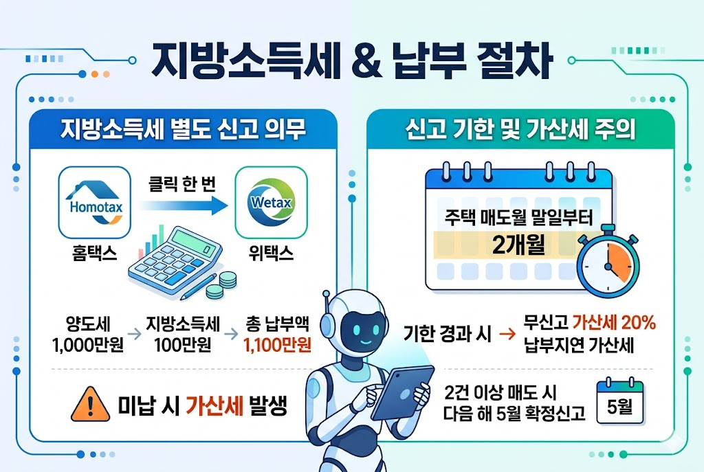 양도소득세액의 10%에 해당하는 금액을 '지방소득세'로 별도 신고해야 합니다. 예를 들어 양도세가 1,000만 원이라면 총 납부액은 1,100만 원이 됩니다. 최근에는 전자신고 시스템이 연동되어 홈택스에서 양도세 신고 후 클릭 한 번으로 위택스를 통해 지방소득세까지 납부가 가능합니다. 이를 간과할 경우 미납에 따른 가산세가 발생할 수 있으므로 최종 결제 단계까지 꼼꼼하게 확인하는 과정이 필요합니다.