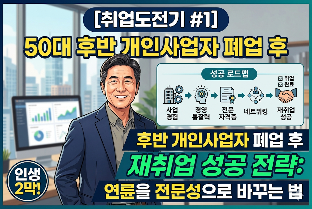 50대 후반 개인사업자 폐업 후 재취업은 '경력의 단절'이 아닌 '경험의 확장'입니다. 정부 지원 제도인 희망리턴패키지를 통해 폐업 절차를 안정적으로 마무리하고, 사업 경영에서 얻은 통찰력을 중장년 전문 인력 채용 시장에 맞게 재포장하는 것이 핵심입니다. 맞춤형 자격증 취득과 네트워킹을 통해 제2의 월급날을 만드는 구체적인 로드맵을 제시합니다.