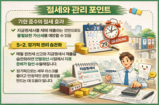 지급명세서를 제때 제출하는 것만으로도 불필요한 가산세를 예방할 수 있습니다. 이는 특별한 절세 기술보다 더 효과적인 방법으로, 단순히 기한을 지키는 습관이 곧 절세 전략이 됩니다.